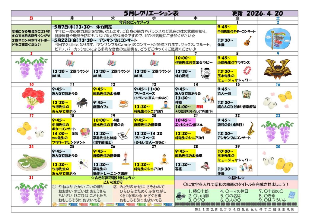 毎月楽しみにして頂いているレクリエーションのお知らせです。
