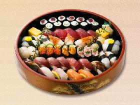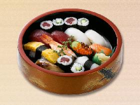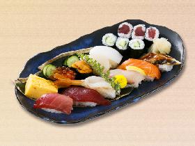 マグロ、イカ、玉子、エビ、イクラ、サーモン、穴子、タコ、鉄火巻、カッパ巻